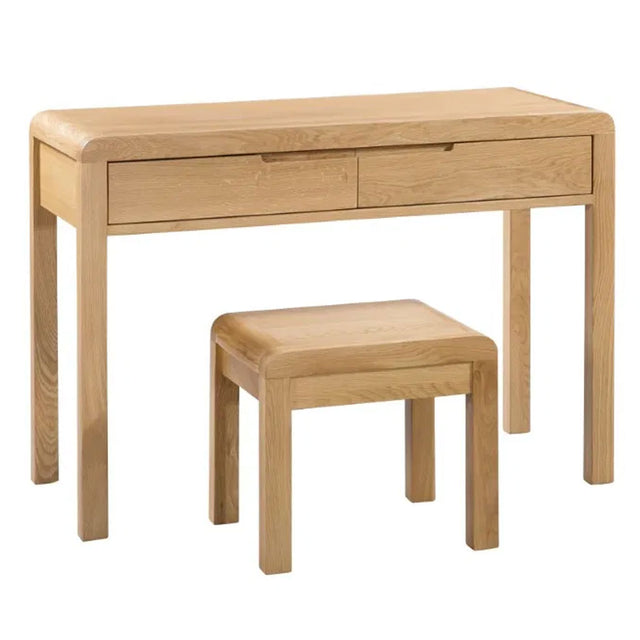 Create a stylish and functional space for your morning routine with the Curve Wooden Dressing Table with 2 Drawers and Stool, available at CozyFurnitureDirect. Expertly crafted from solid white oak and oak veneers, this elegant dressing table features clean lines softened by the collection's signature curved edging for a refined and modern look. Two drawers with recessed handles offer handy storage for cosmetics, jewellery, or everyday essentials, keeping surfaces clutter-free. The matching stool completes the set, providing comfort and a cohesive finish. Modern yet timeless, the Curve dressing table is a sophisticated choice for UK bedrooms.