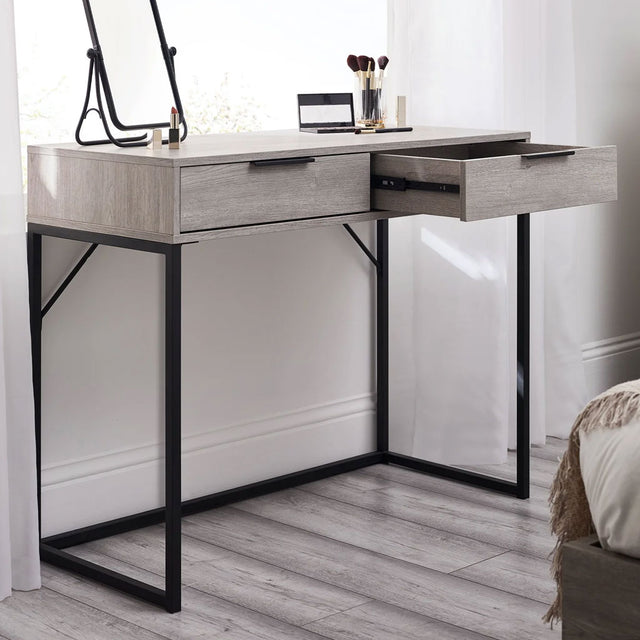 Add timeless industrial-inspired charm to your bedroom with the Bali Wooden Dressing Table with 2 Drawers, available at CozyFurnitureDirect. Perfectly blending rustic warmth with contemporary style, this versatile dressing table is designed for both function and aesthetics. Its beautiful wood-effect finish is complemented by striking black legs and handles, creating a distinctive modern-industrial look that suits a variety of interior styles. With two spacious drawers, it offers practical storage for beauty products, accessories, or everyday essentials, while the sleek table top provides ample space for a mirror or decorative items. Built with innovative click furniture technology, the Bali dressing table ensures effortless assembly without compromising quality. It works beautifully as a vanity or doubles up as a compact desk, making it a stylish and practical addition to any UK home.