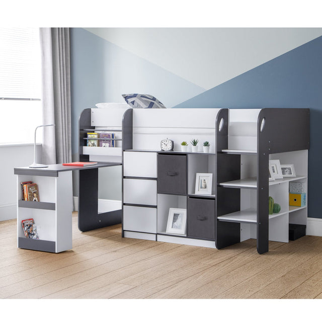 Make the most of your child - s bedroom space with the Saturn Wooden Mid Sleeper Bed, available exclusively from CozyFurnitureDirect. Designed for both practicality and style, this clever mid sleeper combines a comfortable sleeping area with built-in storage, including a three-drawer chest, cube bookcase and open shelving - perfect for books, toys or clothes. Crafted from durable particleboard with a sturdy slatted base, the Saturn bed ensures a secure and supportive night - s sleep. Its smart, space-saving design fits effortlessly into any modern UK home, making it ideal for growing children who need both comfort and organisation in one sleek unit.