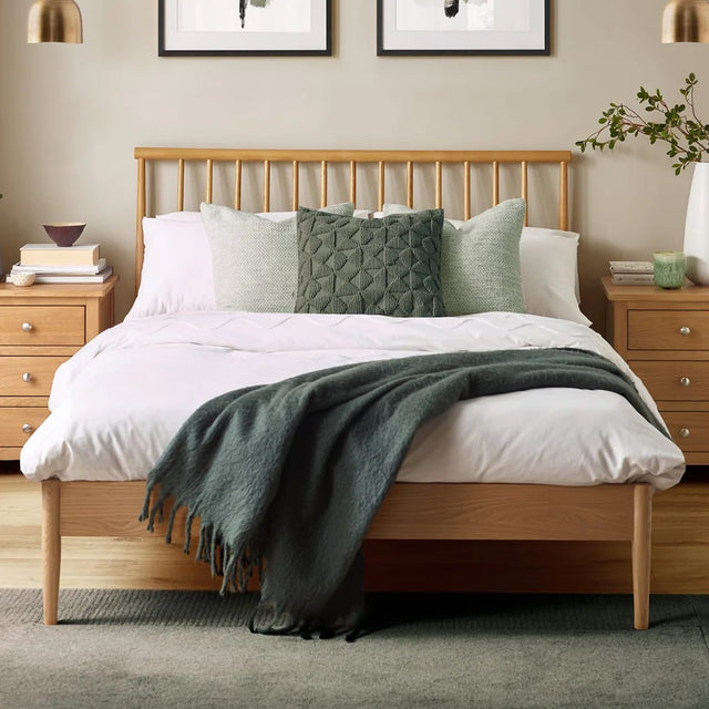Enhance your bedroom with the timeless charm of the Wooden Spindle Double Bed - Belton, available exclusively at CozyFurnitureDirect. This beautifully crafted 135cm bed features a gently slanted spindle headboard that adds an open, airy look while maintaining a sophisticated feel. The solid oak frame brings natural warmth, strength, and character to your home, blending effortlessly with both modern and traditional interiors. Its minimalist design, complemented by sleek tapered legs, ensures it serves as a stylish focal point in any room. With a durable slatted base providing reliable mattress support, the Belton bed combines strength, comfort, and craftsmanship in perfect harmony for a peaceful night's sleep every time.