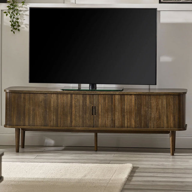 Enhance your living - room with the Arya Wooden TV Stand with 2 Sliding Doors, available at CozyFurnitureDirect. This elegant media unit combines modern style and practical storage, finished in a rich dark oak effect that adds depth and warmth to any space. Its unique slatted sliding tambour doors open smoothly to reveal six spacious shelves and smaller side compartments, perfect for organising DVDs, gaming consoles, media accessories, and decorative items. The Arya TV Stand is supported by sleek Nordic tapered legs and features functional cut-out handles, marrying mid-century charm with contemporary design. Whether tidying away electronics or displaying favourite accessories, this versatile unit offers both style and easy access, making it a standout addition to UK homes.