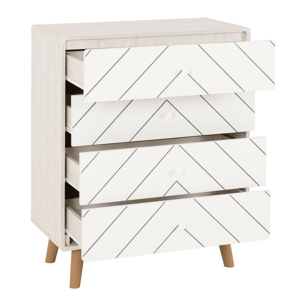 Upgrade your bedroom storage with the Dixie Wooden Chest Of 4 Drawers from CozyFurnitureDirect, designed to blend durability with modern style tailored for UK homes. Crafted from a sturdy composite board frame and enhanced with an eye-catching 3D plastic and paper veneer finish, this chest offers a textured look that adds depth and character to any room. The four spacious drawers glide smoothly on metal runners and feature user-friendly plastic handles for effortless accessibility. Supported by robust MDF jointing and back panels, along with protective plastic feet, this piece ensures lasting stability and floor protection. The 15mm thick top is perfect for displaying lamps, books, or personal treasures, while the included anti-tip strap enhances safety, making the Dixie chest a practical and stylish bedroom essential.