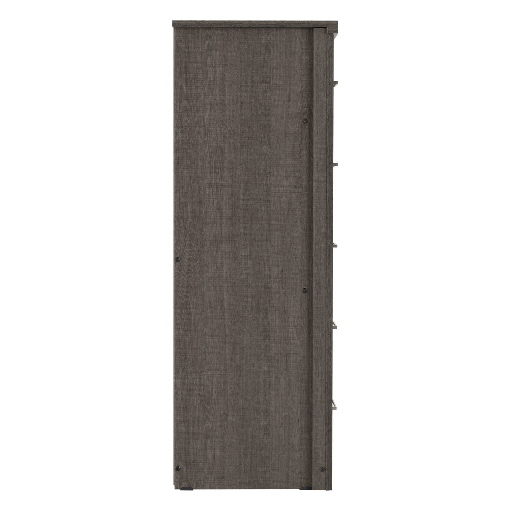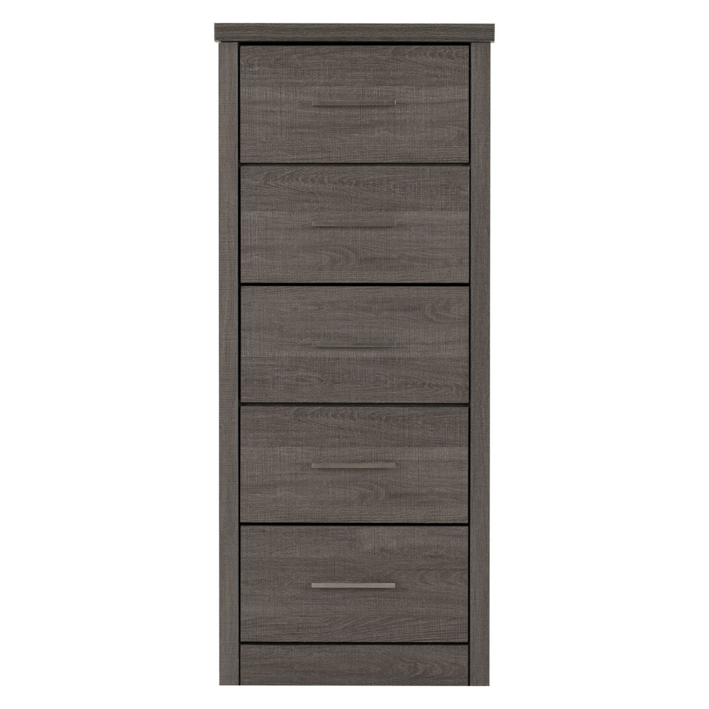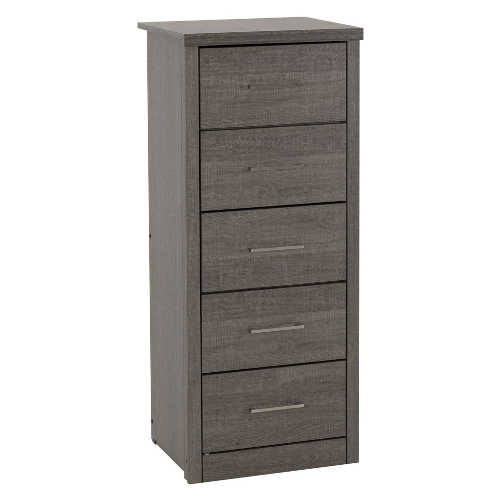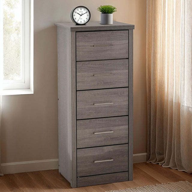 Maximise storage in compact spaces with the Lisbon Wooden Chest Of 5 Drawers Narrow from CozyFurnitureDirect, designed to meet the needs of UK homes with a stylish yet space-saving approach. Crafted from robust composite board and finished with a refined paper and plastic veneer, this chest combines durability with modern elegance. Offering five narrow drawers with smooth metal runners and sturdy metal handles, it is perfect for organising essentials while maintaining a neat and tidy bedroom. Reinforced with strong MDF back panels and drawer bases, it promises lasting quality. The included anti-tip strap ensures additional safety, making the Lisbon chest a practical and attractive storage solution for British bedrooms.