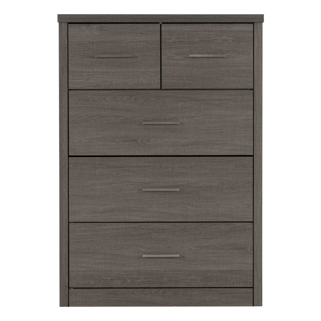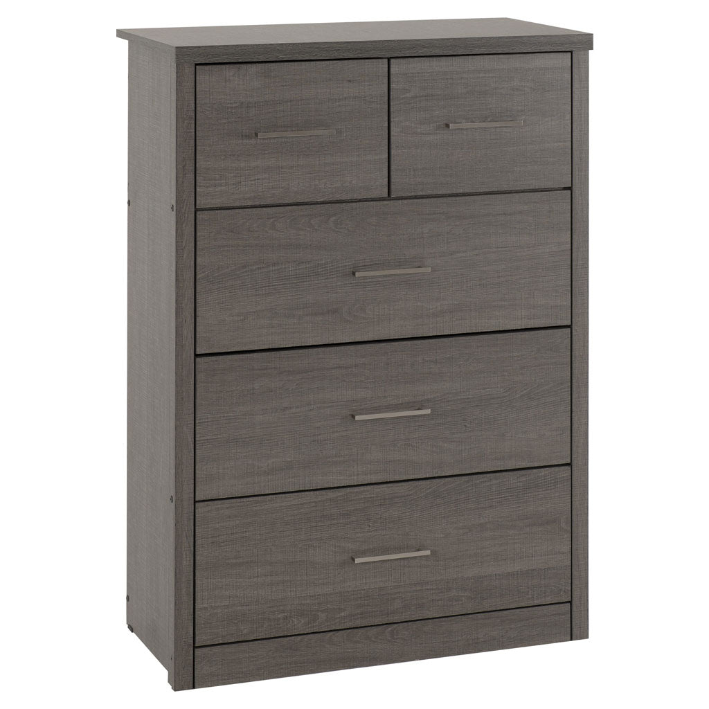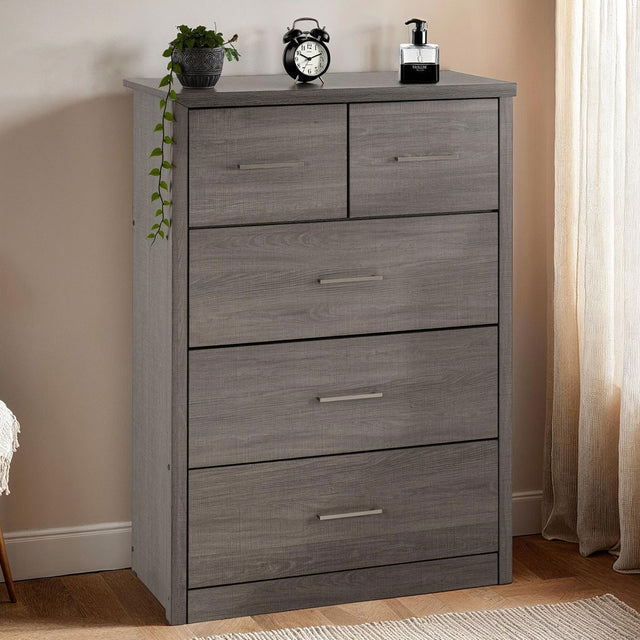 Enhance your bedroom with the spacious and stylish Lisbon Wooden Chest Of 5 Drawers Wide from CozyFurnitureDirect, crafted to meet the storage needs of UK homes. This chest combines a sturdy composite board frame with a refined paper and plastic veneer finish that adds a modern touch to any interior. It features a mix of large and small drawers, providing versatile storage options for clothes, accessories, and essentials. Equipped with smooth metal runners and durable metal handles, the drawers offer effortless access. The robust MDF back panel and drawer bases ensure long - lasting performance, while the 30mm thick top adds strength and durability. The included anti-tip strap offers added safety, making this chest a practical and elegant choice for British bedrooms.