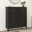 Bring order and style to your hallway or bedroom with the Barcelona Wooden Shoe Storage Cabinet With 4 Compartments, available at CozyFurnitureDirect. Designed with a sleek contemporary look and finished with elegant leather tab handles, this cabinet blends practicality with modern charm. With four spacious compartments, it offers an ideal solution for neatly organising your footwear while keeping your space clutter - free. built - In Denmark from PEFC certified sustainable wood and a High - quality laminated board that resists scratches, moisture, and heat, it is made to withstand daily use in busy British homes. Whether you choose the striking matt black, crisp white, or complement it with other pieces from the Barcelona collection, this shoe cabinet delivers durability, style, and eco - friendly craftsmanship in one compact, space-saving design.