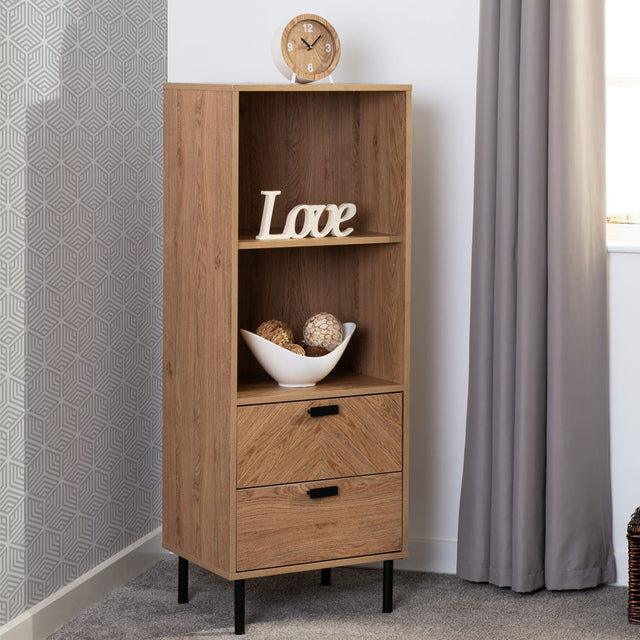 Organise your living space with the elegant and practical Leon Wooden Storage Cabinet With 2 Drawers And 2 Shelves from CozyFurnitureDirect, specifically designed for UK homes. Crafted from robust composite board and finished with a textured 3D paper and plastic veneer, this cabinet blends modern style with exceptional durability. It features two spacious drawers that glide smoothly on metal runners, ideal for tidying essentials, as well as two adjustable shelves providing versatile storage or display options. Supported by sturdy MDF panels and resting on durable metal feet, the cabinet ensures stability and floor protection. An included anti-tip strap adds an extra layer of safety, making the Leon storage cabinet a smart and stylish choice for British interiors.