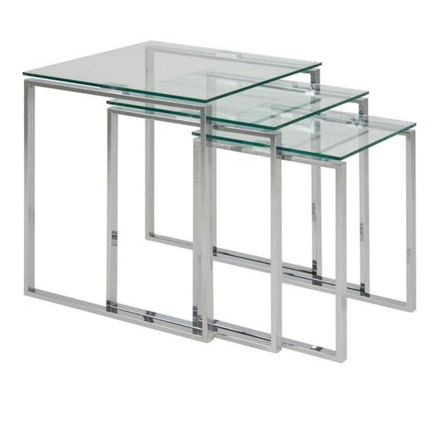 Bring versatility and modern elegance into your home with the Glass Nest of 3 Tables - Katrine, available at CozyFurnitureDirect. This sleek set includes three tables of graduated sizes, each featuring a Clear or Smoked tempered glass top supported by a polished chrome steel sledge base. Combining durability with contemporary style, the Katrine nest of tables is both a functional solution and a refined accent for UK interiors. Perfect for use in living - rooms, lounges, or even home offices, these tables provide flexible extra surface space for drinks, decor, or occasional use. When not in use, they neatly nest together, saving valuable floor space without compromising aesthetics. With their clean design and quality materials, they suit both modern and traditional homes, adding lightness and sophistication to your decor.