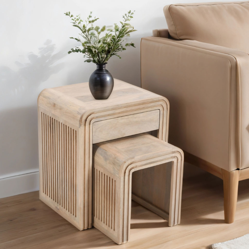 Bring exotic charm and versatile functionality to your living area with the Solid Hardwood Nest Of 2 Tables With Drawer - Hudson, offered by CozyFurnitureDirect. Handcrafted from sustainable mango wood, this elegant set features two tables that nest neatly to save space or separate effortlessly for additional surface area. Intricate hand-carved detailing on the table tops adds distinctive texture and sophistication, while the natural oak lacquered finish highlights the wood's rich warmth and protects the surface. Fully assembled and easy to maintain, the Hudson nest tables perfectly combine style and practicality for contemporary British homes.