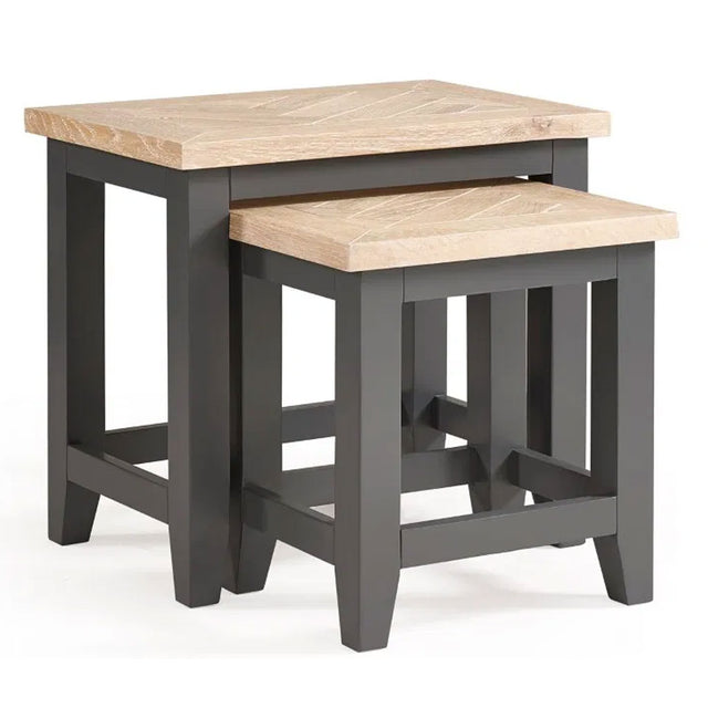 Add timeless versatility and rustic elegance to your home with the Bordeaux Wooden Nest of 2 Tables, available at CozyFurnitureDirect. Finished in a sleek dark grey lacquer and topped with a substantial oak parquet design, these tables combine classic charm with practical flexibility. Perfect for living - rooms or lounges, the set includes two tables that can be used together for extra surface space or neatly nested away when not in use, creating a smart space-saving solution. Blending durability with sophisticated design, the Bordeaux nest of tables complements both traditional and modern UK interiors seamlessly.