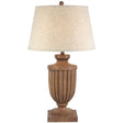 - Smoothly contoured wooden base paired with an elegant edged linen shade.
