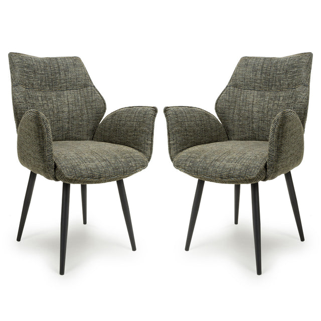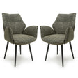 Bring style, comfort, and functionality to your dining space with the Baltimore Fabric Swivel Dining Chairs from CozyFurnitureDirect. Sold in a set of two, these chic modernistic chairs feature an ergonomic design with high curved winged arms and an angled backrest for superior support. Upholstered in soft moss green fabric with a subtle woven texture, pleated stitching, and piped edging, the Baltimore chairs offer both elegance and detail. Their 360-degree swivel function adds convenience and flexibility, while the tapered black metal legs provide stability and a sleek contemporary edge. Perfect for UK homes, these chairs effortlessly blend practicality with modern design.