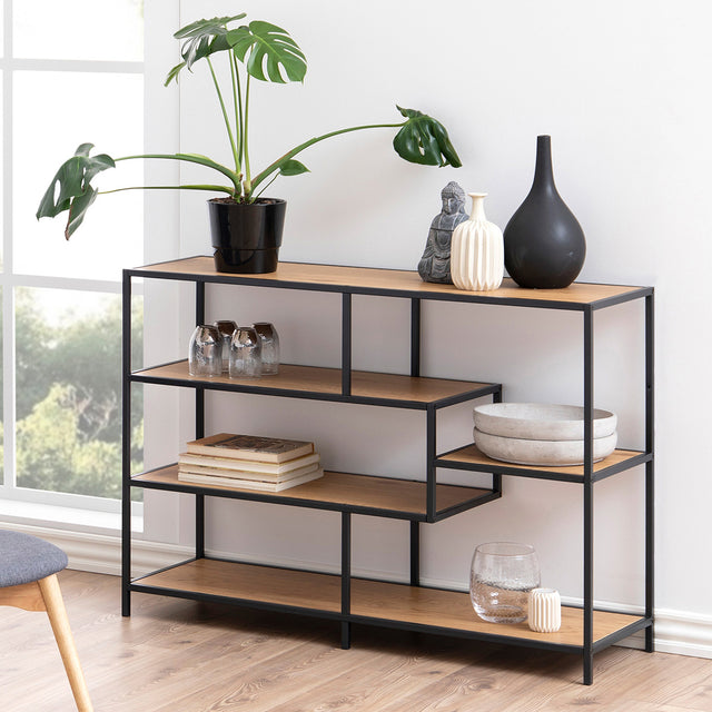 Add contemporary flair to your interior with the Seaford Wide Metal Bookcase in Black with 4 Shelves, available at CozyFurnitureDirect. Crafted with a sturdy matte black steel frame and base, and finished with wild oak effect shelves, this bookcase combines industrial strength with modern elegance. Its asymmetrical shelf design creates a visually striking appeal, making it not only a practical storage solution but also a decorative focal point. Compact yet versatile, it is perfect for storing books, ornaments, or displaying your favourite decor in any UK home.