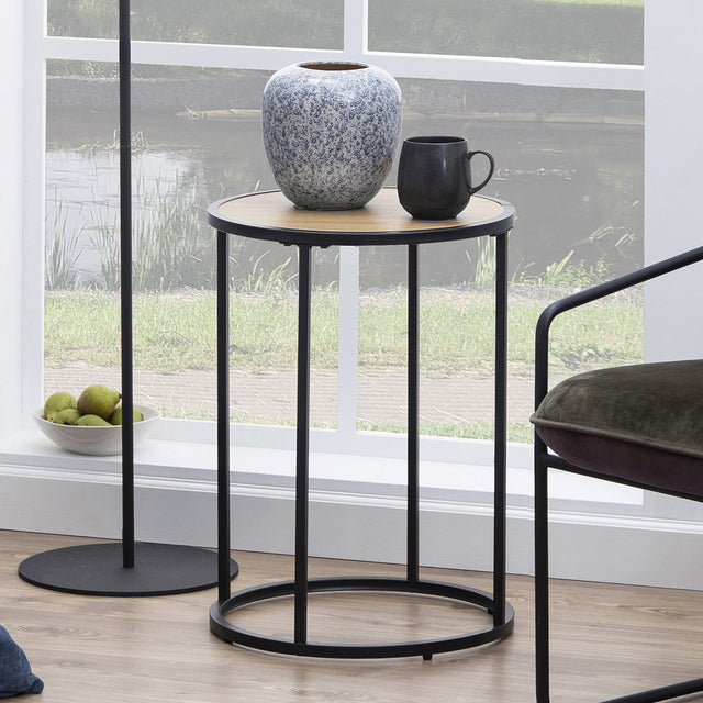 Add a touch of elegance to your living space with the Seaford Round Metal Side Table in Black with Wooden Top, available at CozyFurnitureDirect. Designed with a minimalist round form, this compact side table blends a warm wild oak effect top with a sturdy matte black steel base for an industrial yet refined look. Lightweight and versatile, it works perfectly as a stylish accent table next to your sofa, armchair, or bed, offering both practicality and modern charm.