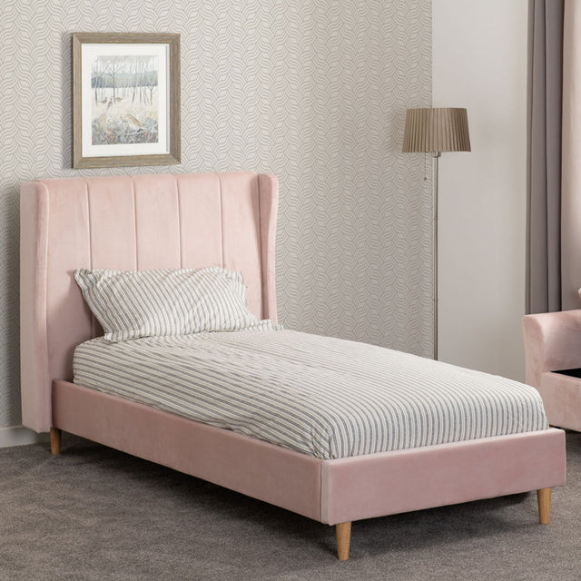 Add a touch of luxury and comfort to your bedroom with the Amelia Velvet Single Bed, available at CozyFurnitureDirect UK. Upholstered in soft velvet fabric with elegant detailing, this stylish single bed offers a perfect blend of sophistication and practicality. Ideal for children's rooms, guest spaces or compact bedrooms, the Amelia brings premium comfort without taking up unnecessary space. Featuring 13 laminated sprung slats, this bed ensures excellent mattress support and optimal comfort for a restful night's sleep. The tall padded headboard with a height of 116.5cm creates a striking focal point while offering comfort for sitting up and reading in bed. With its sturdy plywood and metal frame, reinforced with stable wooden feet, the Amelia bed delivers both glamour and everyday durability. Perfectly suited for modern UK homes, the Amelia Velvet Single Bed is an elegant statement piece that elevates any sleeping space.