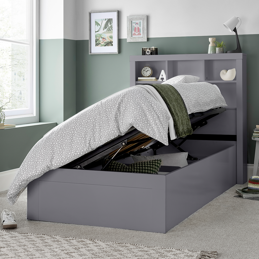 Wooden Single Ottoman Storage Bed With Bookcase Headboard - Oscar