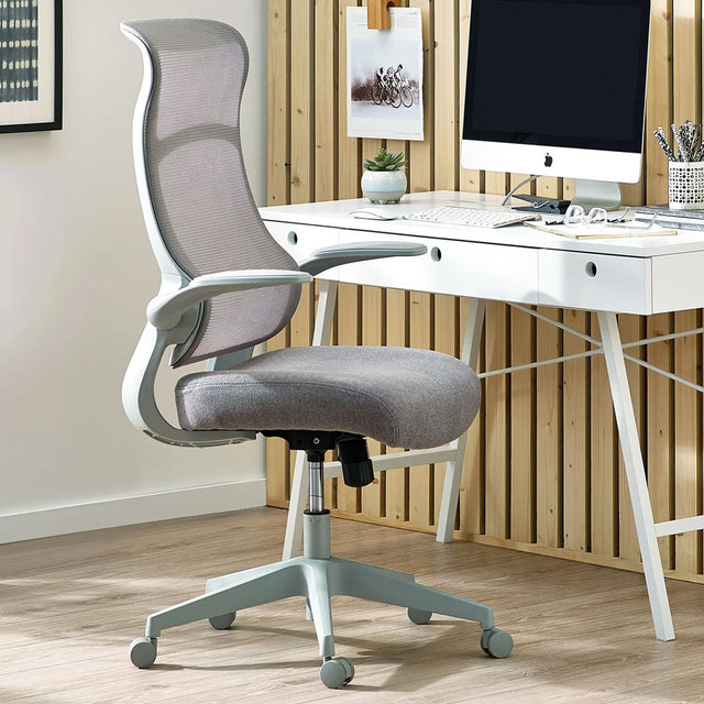 Upgrade your workspace with the Archer Fabric Home and Office Chair, available at CozyFurnitureDirect. Designed for both comfort and productivity, this sleek chair features a slightly curved grey mesh back that ensures breathability and ergonomic support throughout the day. The Archer's adjustable height and tilt mechanism allow you to tailor the chair to your posture, helping to reduce fatigue and encourage better sitting habits during long working hours. A soft-touch upholstered seat with a sloping front edge alleviates pressure on the legs, while flip-up armrests add versatility and convenience. Supported by a sturdy grey star base with five smooth-rolling coasters, the Archer Office Chair combines mobility, comfort, and modern style - making it a smart addition to any UK home office or professional workspace.
