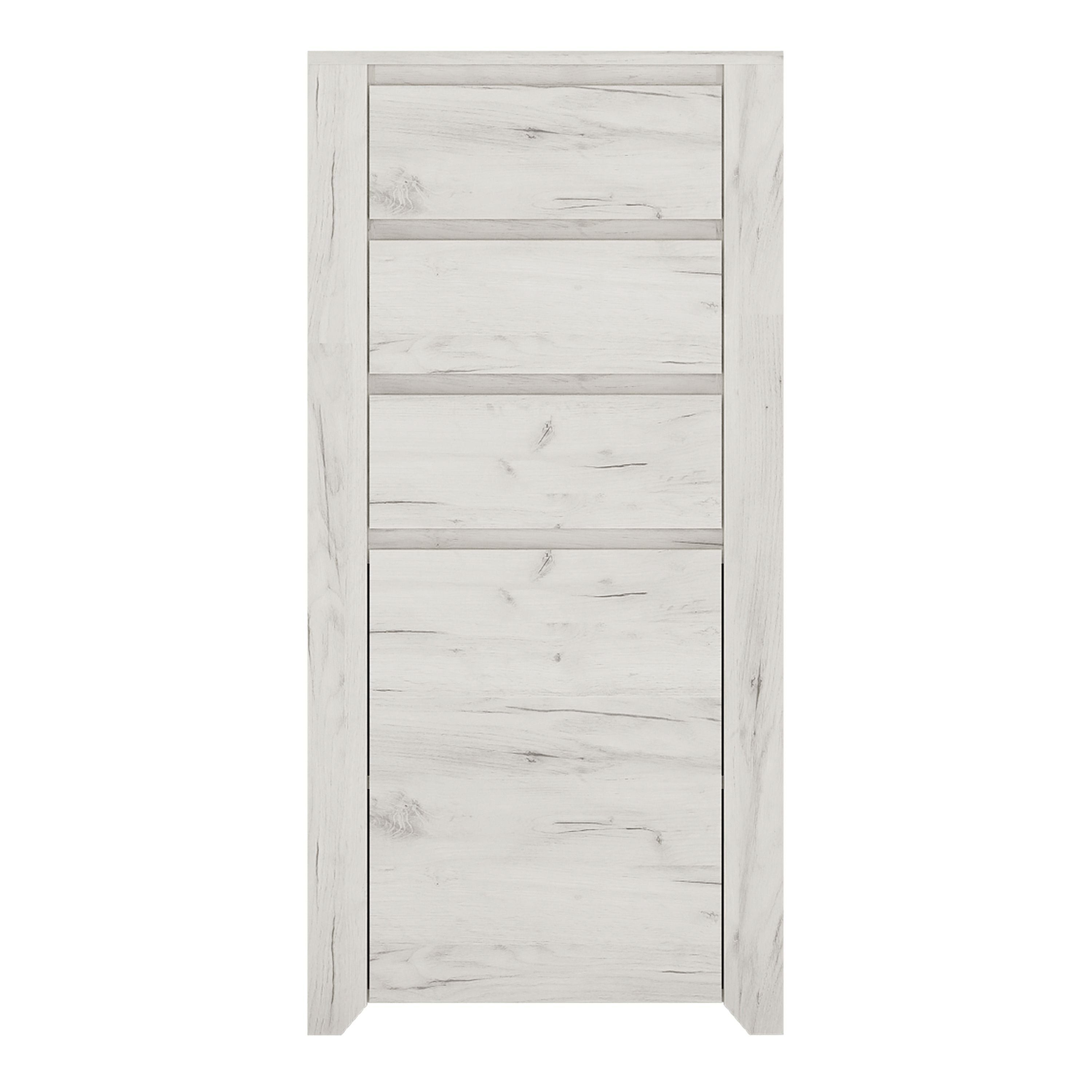 Introduce both style and practicality into your home with the Wooden High board with 1 Door and 3 Drawers - Angel, available at CozyFurnitureDirect. This elegant piece from the Angel bedroom collection combines contemporary design with smart storage solutions, perfect for UK homes of all sizes. Finished in a hard-wearing white crafted oak melamine, this narrow high board offers space-saving storage with three smooth-glide drawers above a cupboard featuring an adjustable interior shelf. Crafted from durable laminated board resistant to scratches, moisture, and high temperatures, the Angel high board is built for lasting use and easy maintenance. Its gently rounded MDF mouldings add a subtle decorative touch, while adjustable door hinges ensure a perfect fit. The compact dimensions make it ideal for bedrooms, hallways, or living areas seeking a blend of elegance and functionality.