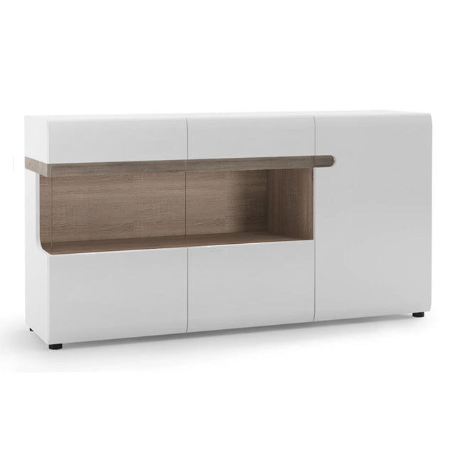 Elevate your home with the Chelsea Living 3 Door Glazed Sideboard in White with Truffle Oak Trim, available from CozyFurnitureDirect - the UK's trusted destination for stylish and functional furniture. This beautifully designed sideboard combines sleek white high gloss fronts with the inviting warmth of a Truffle Oak trim, offering the perfect balance of modern elegance and homely charm. The three-door glazed design features internal shelving, providing generous storage and display options for glassware, dining ware, or cherished ornaments. Crafted from scratch- and moisture-resistant laminated board, it ensures durability and easy maintenance, making it a practical choice for everyday living. A handle-free finish and soft-close mechanism give the sideboard a streamlined, minimalist look with a premium feel. Whether enhancing your dining room, living space, or hallway, the Chelsea Living Glazed Sideboard delivers both style and substance - an ideal choice for contemporary UK interiors.