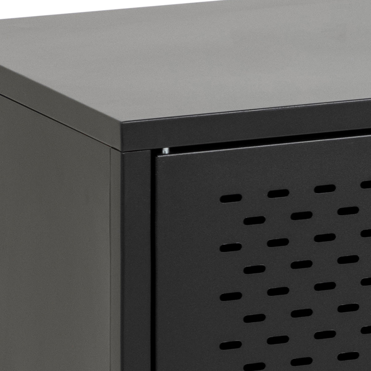 - Three perforated metal doors create a bold modern look while keeping contents neatly enclosed