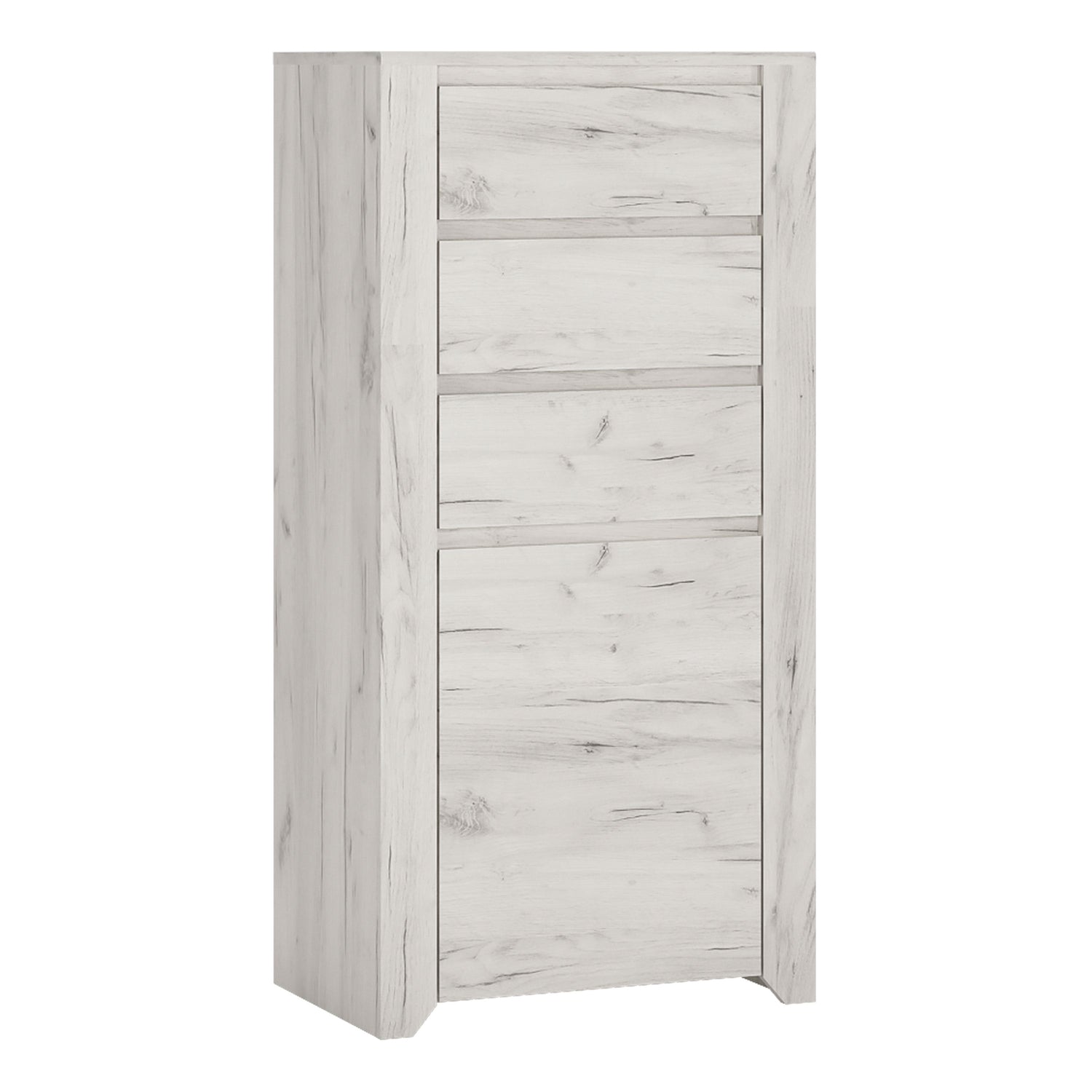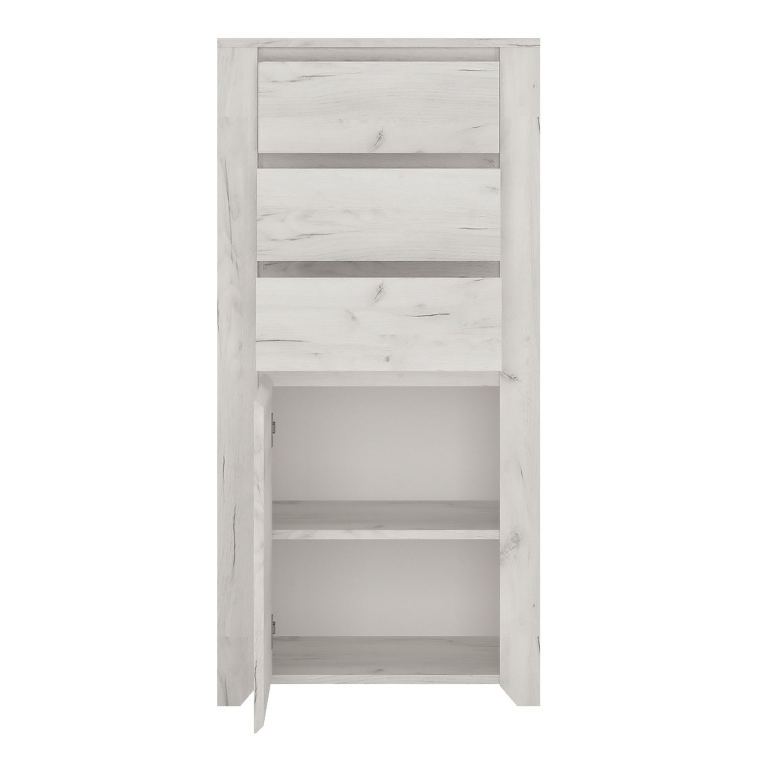 Introduce both style and practicality into your home with the Wooden High board with 1 Door and 3 Drawers - Angel, available at CozyFurnitureDirect. This elegant piece from the Angel bedroom collection combines contemporary design with smart storage solutions, perfect for UK homes of all sizes. Finished in a hard-wearing white crafted oak melamine, this narrow high board offers space-saving storage with three smooth-glide drawers above a cupboard featuring an adjustable interior shelf. Crafted from durable laminated board resistant to scratches, moisture, and high temperatures, the Angel high board is built for lasting use and easy maintenance. Its gently rounded MDF mouldings add a subtle decorative touch, while adjustable door hinges ensure a perfect fit. The compact dimensions make it ideal for bedrooms, hallways, or living areas seeking a blend of elegance and functionality.