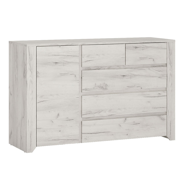 Discover the perfect blend of style and functionality with the Wooden Sideboard with 1 Door and 5 Drawers - Angel, available exclusively at CozyFurnitureDirect. Finished in a modern white crafted oak melamine, this compact yet spacious sideboard is designed to complement contemporary UK bedrooms while offering practical storage solutions for all age groups. Featuring two small drawers above three wider ones alongside a cupboard section with an interior shelf, the Angel sideboard provides versatile organisation for clothing, accessories, and more. Built from durable laminated board resistant to scratches, moisture, and high temperatures, it promises lasting appeal and easy maintenance. With gently rounded MDF mouldings and smooth metal drawer runners, this piece combines elegance with effortless use, making it ideal for modern living spaces in the UK.