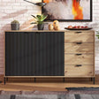 Elevate your living space with the Wooden Sideboard With 2 Doors And 4 Drawers - Velamina, available at CozyFurnitureDirect. The Velamina sideboard features a beautiful artisan oak effect finish paired with bold black accents, creating a striking and contemporary design. With two doors and four spacious drawers, it offers versatile storage solutions to keep your belongings organised and out of sight. Measuring 92.5cm high, 157cm wide, and 40cm deep, this flat-packed sideboard blends style and functionality, making it an ideal addition to modern British homes.