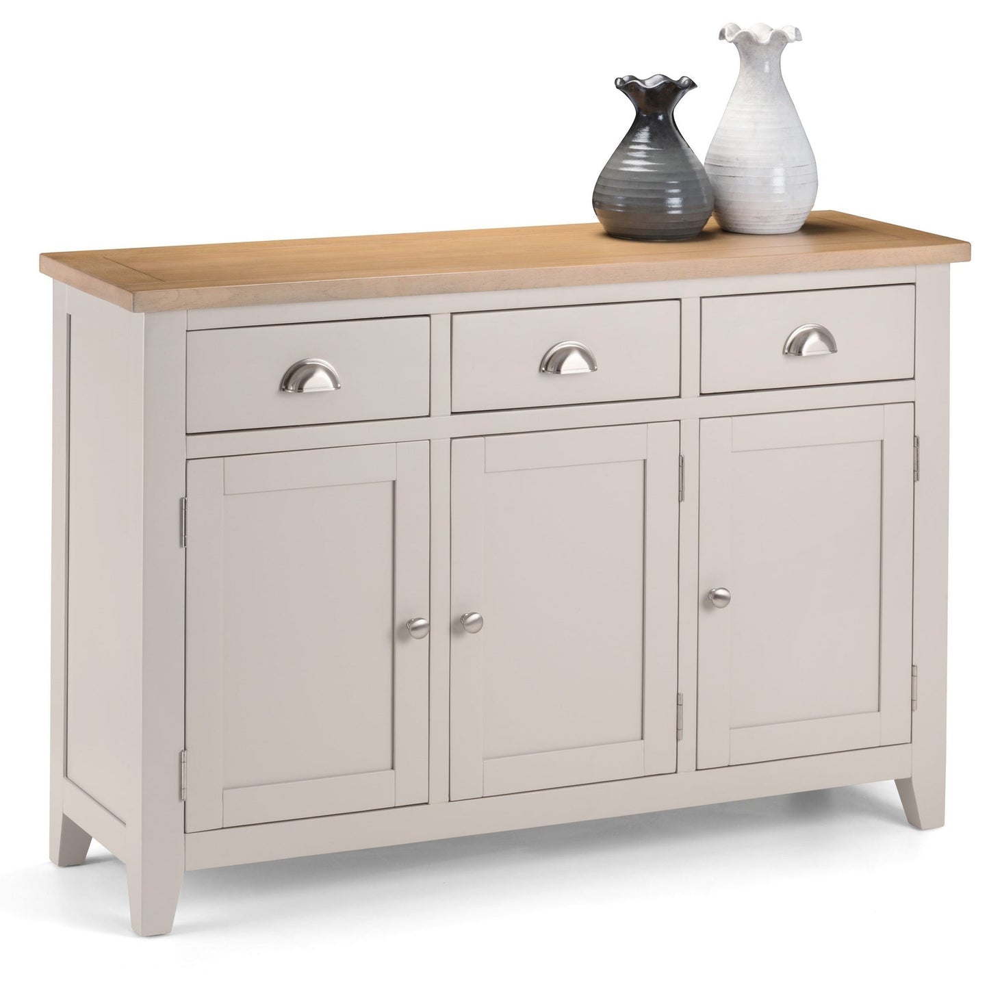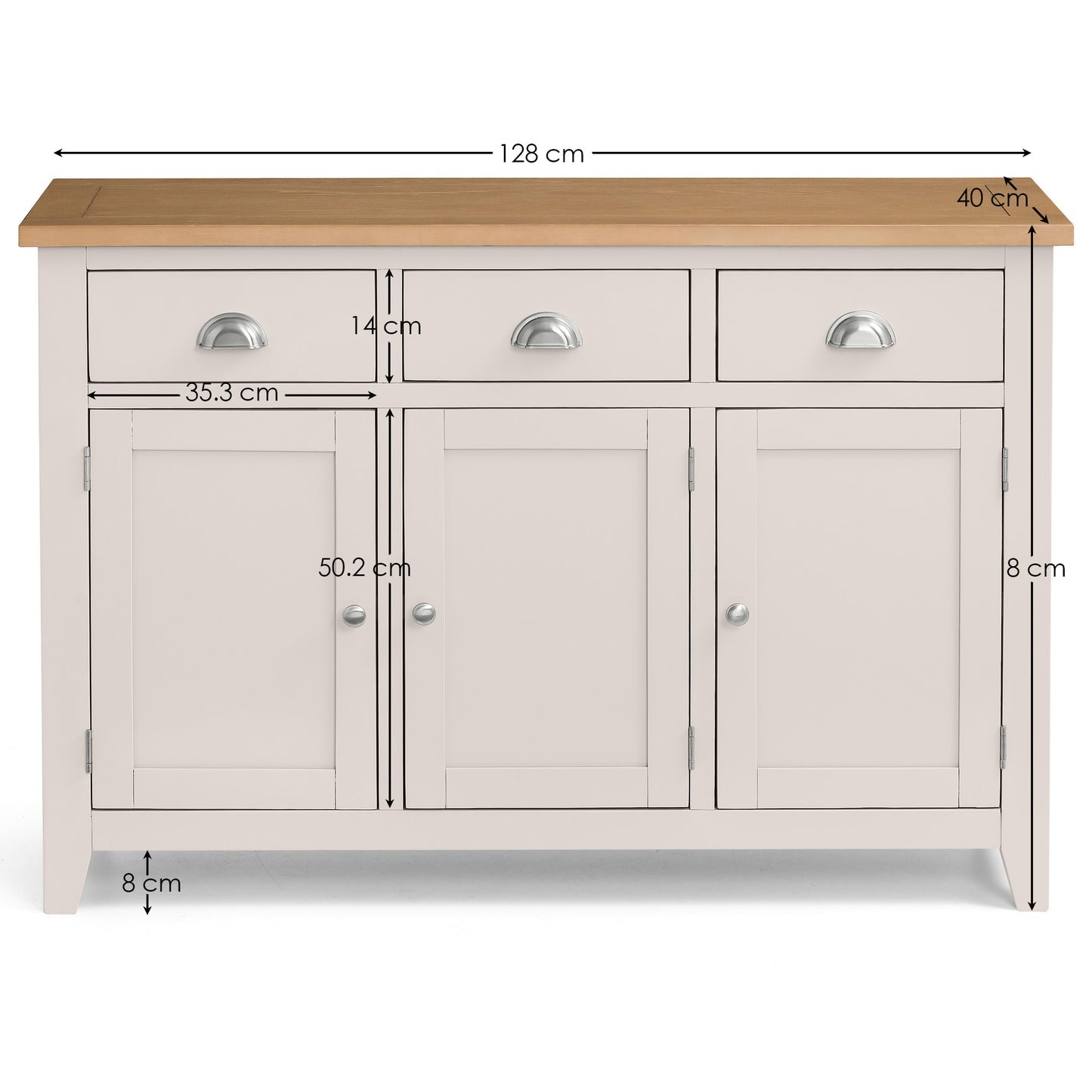 Add timeless elegance and impressive storage capacity to your home with the Richmond Wooden Sideboard with 3 Doors and 3 Drawers from CozyFurnitureDirect. Crafted from high-grade white oak solids and veneers, this refined piece showcases a soft Elephant Grey painted finish with a beautifully pale oak top, achieving a classic yet contemporary look. The Richmond sideboard offers ample space to keep your dining or living area organised, featuring three roomy drawers above a double and single cupboard - perfect for storing cutlery, crockery and glassware. Complemented by brushed steel cupped handles, this stylish design pairs durability with sophistication, making it an exceptional addition to any UK home.