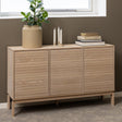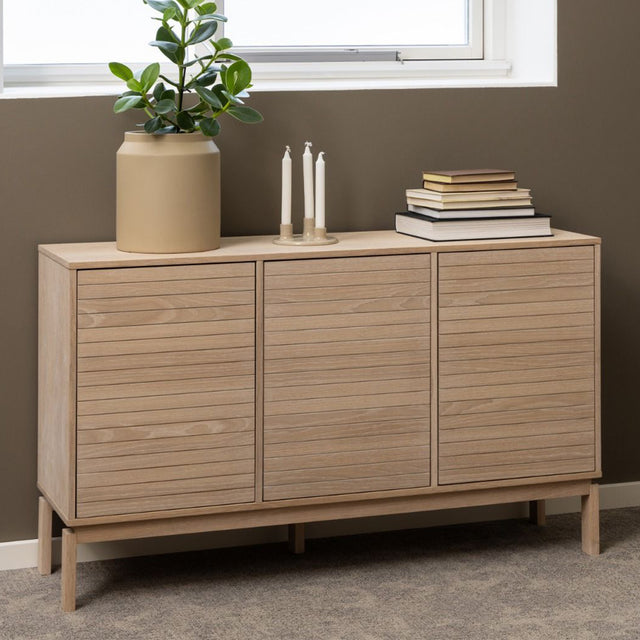 Bring elegance and practicality to your home with the Linley Wooden Sideboard with 3 Doors, available at CozyFurnitureDirect. Finished in a refined white pigmented oiled oak effect with a sleek veneer, this sideboard offers a timeless design that suits both modern and traditional interiors. The three lamella-fronted doors give it a distinctive Scandinavian-inspired look, while the push-to-open mechanism ensures a smooth and minimalist appearance. Inside, adjustable shelves provide versatile storage options for dining essentials, decorative items, or household accessories, making it a stylish yet functional addition to UK homes.