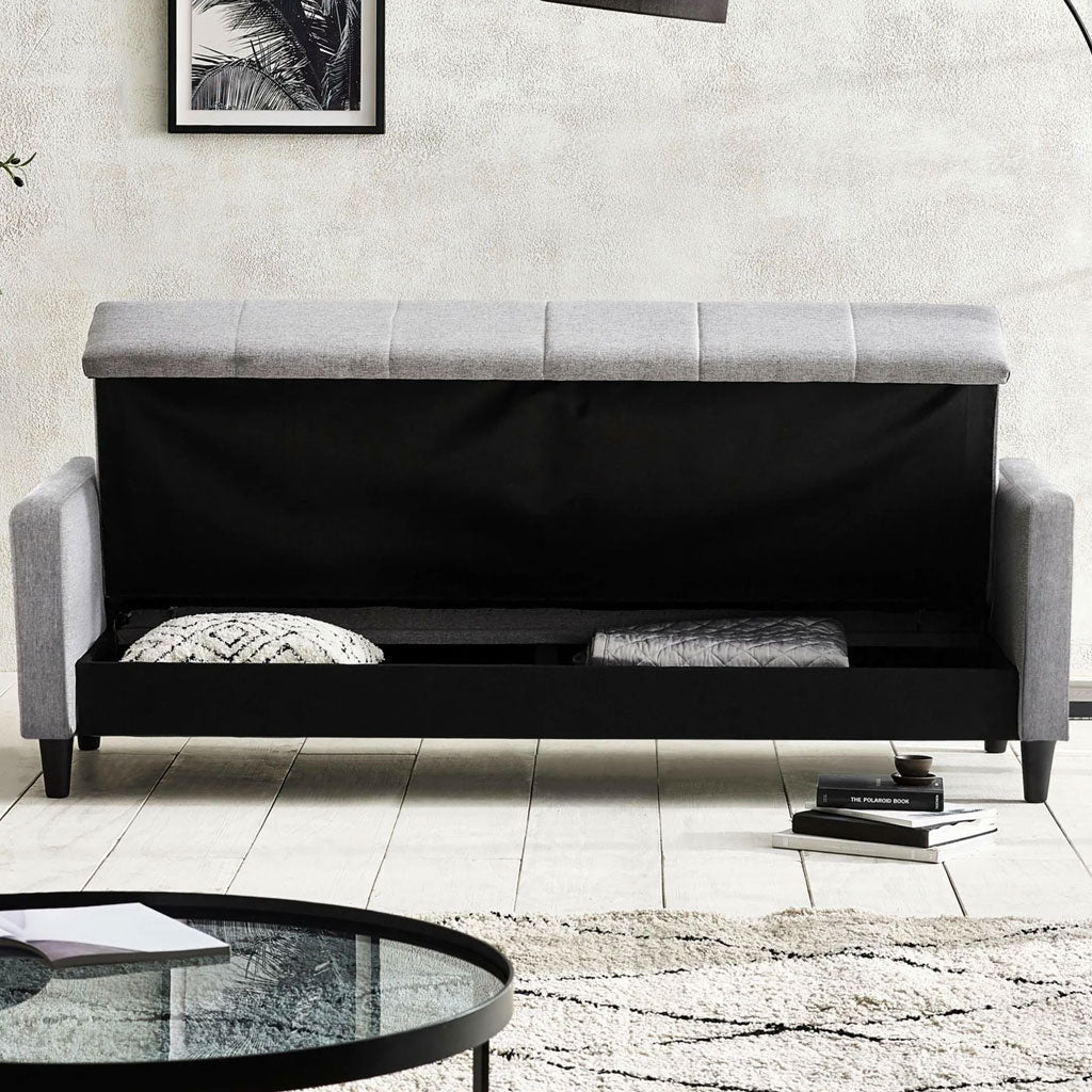 Maximise comfort, storage and style with the Alfie Linen Fabric Sofa Bed, 201cm Wide, available at CozyFurnitureDirect. Perfect for modern UK homes, this versatile sofa bed is upholstered in soft yet durable grey linen-style fabric, offering a cosy seating experience with plush cushioning and a supportive backrest. Its tufted detailing and minimalist design make it a timeless piece that complements both contemporary and traditional interiors. Designed with practicality in mind, the Alfie Sofa Bed features a hidden storage compartment underneath the seat, ideal for neatly stowing away blankets, cushions or everyday essentials. The easy click-clack mechanism allows you to quickly transform the sofa into a comfortable guest bed whenever required, making it an excellent solution for space-conscious households.