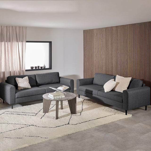 Redefine your living space with the Fabric 3 + 3 Seater Sofa Set with Matt Black Steel Legs - Omaha, available at CozyFurnitureDirect. This package includes two spacious 3 seater sofas upholstered in Basel Dark Grey fabric, combining sleek design with everyday practicality. Offering a combined seating width of over 4 metres, this set is perfect for family gatherings, entertaining guests, or simply stretching out in comfort. With Nozag springs and supportive static back cushions, the Omaha sofas guarantee premium comfort, while the fire-resistant fabric ensures safety and peace of mind. Finished with minimalist matt black steel legs, this set blends durability with a modern, understated look that complements any UK interior.