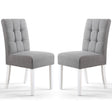 The Moseley Waffle Linen Effect Fabric Dining Chairs combine modern style with everyday comfort, making them a practical yet elegant choice for UK dining spaces. Available in a set of two from CozyFurnitureDirect, these chairs are upholstered in refined steel grey linen-effect fabric that brings sophistication and versatility to your home decor. The stitched waffle detailing on the backrest adds visual interest and a contemporary edge, while the deep-seated design with sprung and belted seat construction offers reliable comfort and durability. Supported by sleek white rubber wood legs, the Moseley chairs add a fresh, stylish contrast to elevate the look of your dining area.