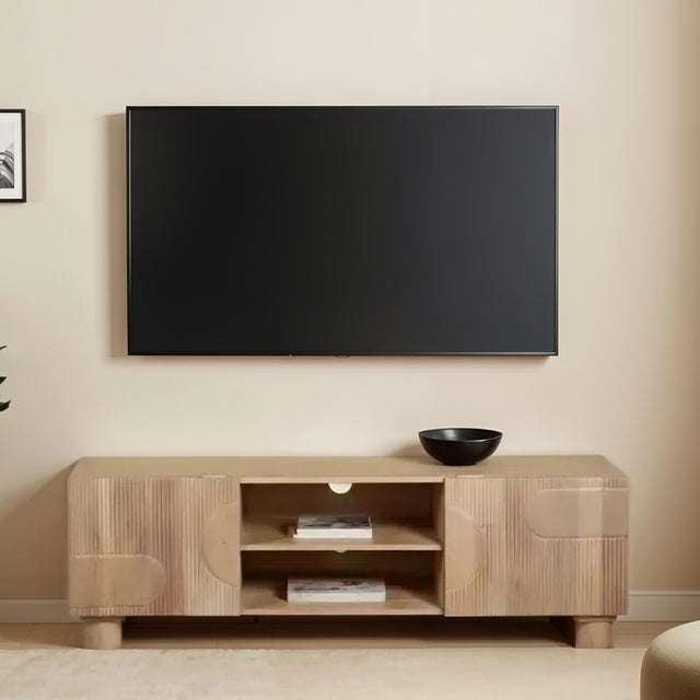 Elevate your entertainment space with the Austin Solid Mango Wood TV Stand with 2 Doors, available exclusively at CozyFurnitureDirect. Designed to combine elegance with everyday functionality, this cabinet is expertly crafted from solid mango wood and finished in a warm light brown tone with a protective water-based lacquer. The result is a durable, eco - friendly piece that highlights the natural beauty of the wood grain while offering long - lasting strength. Measuring perfectly to accommodate televisions up to 60 inches, this TV stand also provides ample storage for media devices, DVDs, and accessories. The two-doors feature a distinctive fluted design, adding a refined texture and contemporary character that makes this piece a true focal point in your living - room. Practical, stylish and crafted with care, the Austin TV Stand is a must-have for modern UK homes.