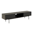 - Contemporary TV stand featuring a black ash finish with a textured, rough look