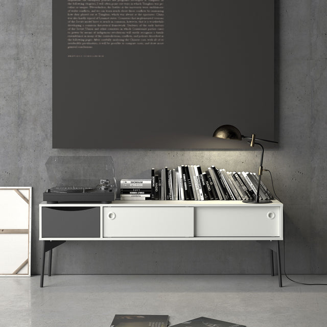 Elevate your living space with the Wooden TV Stand with 2 Sliding Doors and 1 Drawer - Fur, available at CozyFurnitureDirect. Designed in a striking grey and white palette, this TV unit combines modern aesthetics with everyday practicality. The two sliding doors reveal spacious compartments for consoles, DVDs, and media accessories, while the additional drawer offers discreet storage for remotes and smaller essentials. Its clean-lined design and stylish contrast finish make it the perfect centrepiece for contemporary UK living - rooms. Crafted in Denmark from durable scratch-resistant materials, the Fur TV Stand is built to last while adding a bold, modern edge to your home.