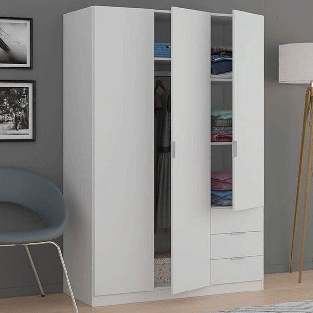Optimise your bedroom with the Wooden Wardrobe 121cm Wide With 3 Doors And 3 Drawers - Carmel, available at CozyFurnitureDirect. The Carmel wardrobe features a crisp finish that blends seamlessly with modern decor, offering three doors that open to versatile hanging space perfect for organising your garments. Three spacious drawers below provide additional storage for accessories or folded clothes, making this compact wardrobe an excellent choice for smaller bedrooms in British homes. Its elegant design ensures efficient storage with timeless style and durability.