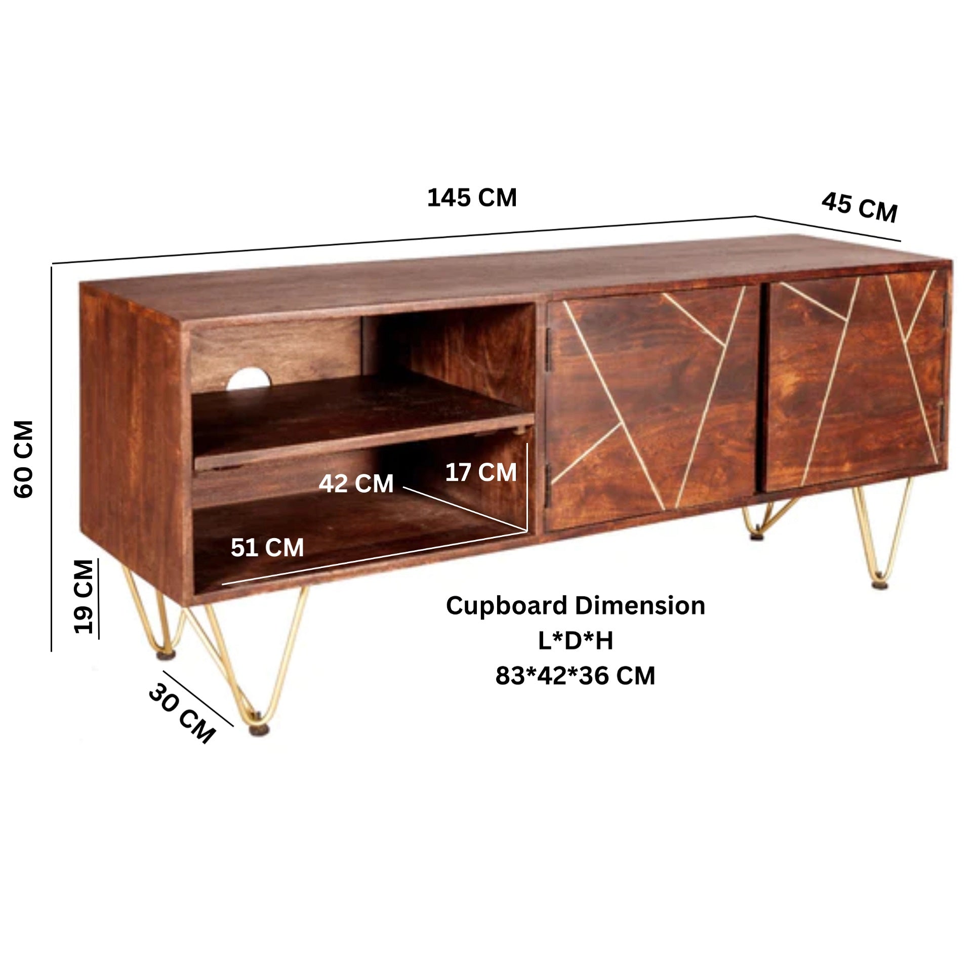 Enhance your entertainment space with the Solid Mango Wood TV Stand With 2 Doors And 2 Shelves in Dark Gold from CozyFurnitureDirect. This modern contemporary piece combines solid mango wood with sophisticated gold metal inlays, creating an abstract style that elevates any room. The angled metal legs contribute a retro vintage touch while providing strong and stable support. Fully assembled and crafted from eco - friendly wood with natural colour variations, this TV stand offers practical storage behind doors and open shelving, making it a stylish and functional addition to British homes.