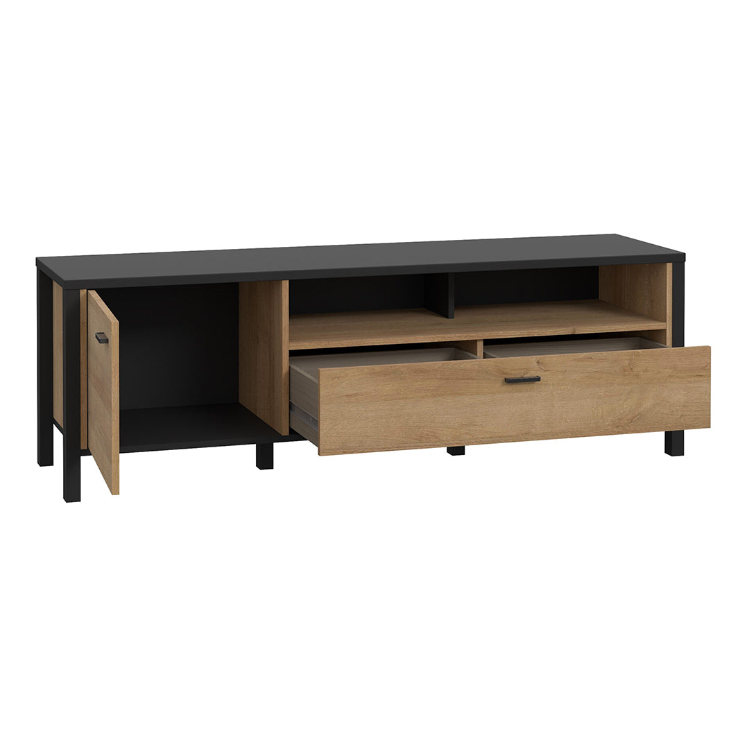 Enhance your living - room setup with the Wooden TV Stand with 1 Door and 1 Drawer - High Rock, available at CozyFurnitureDirect. Part of the contemporary High Rock collection, this TV unit blends Riviera Oak decor with striking black accents, delivering a bold industrial - inspired look that suits modern UK homes perfectly. With its clever mix of concealed and open storage, the unit includes a large drawer with two sections, a cupboard door compartment and a handy open shelf - ideal for media consoles, books or decorative items. The seamless storage ensures cables, remotes and accessories can be neatly tucked away while keeping your living space organised. Designed with durability in mind, the TV stand features sleek black metal handles and sits on robust frame-style legs, offering excellent stability and a stylish loft-inspired finish. Its generous width makes it suitable for medium to large-screen televisions, while the clean design ensures it blends beautifully with modern and industrial home interiors.