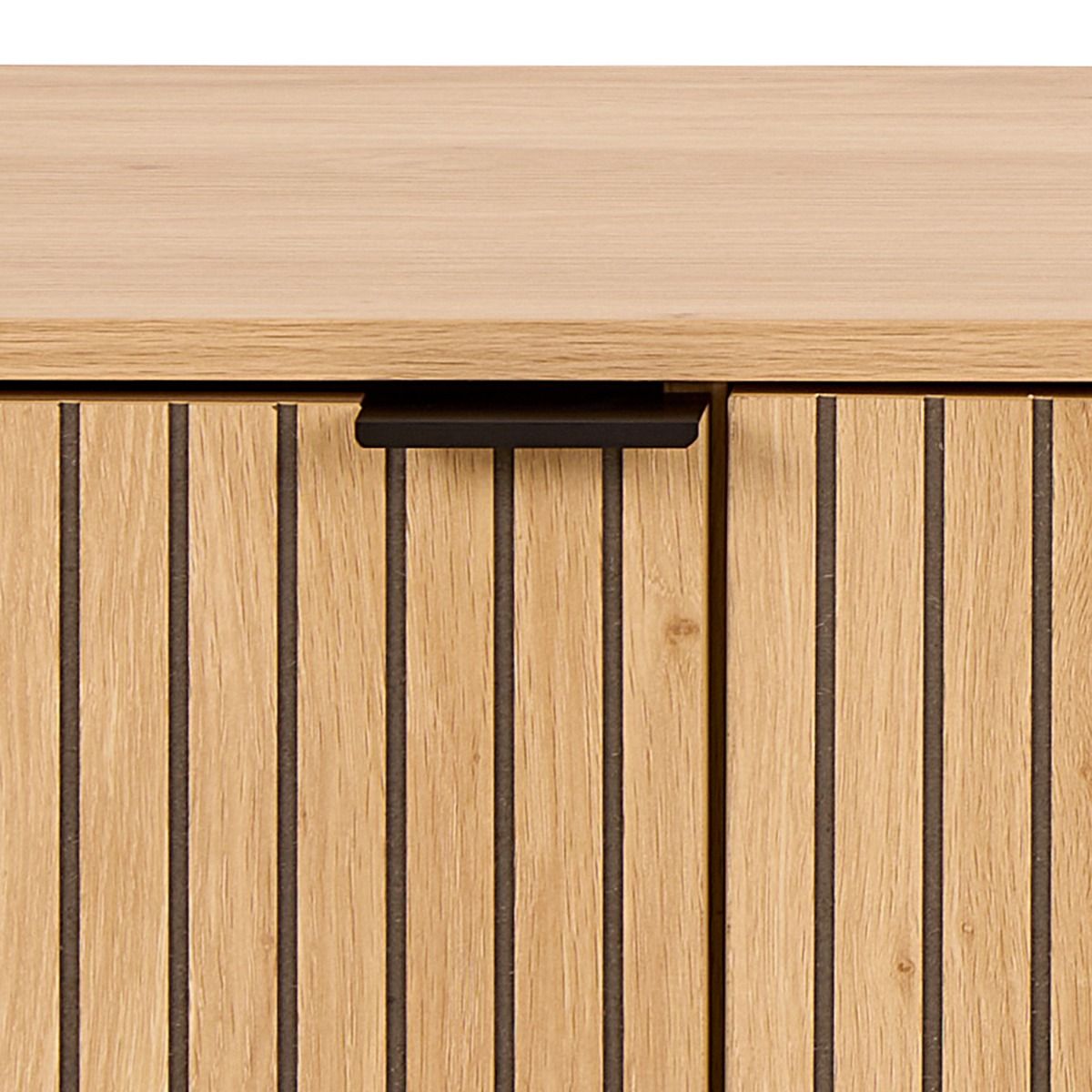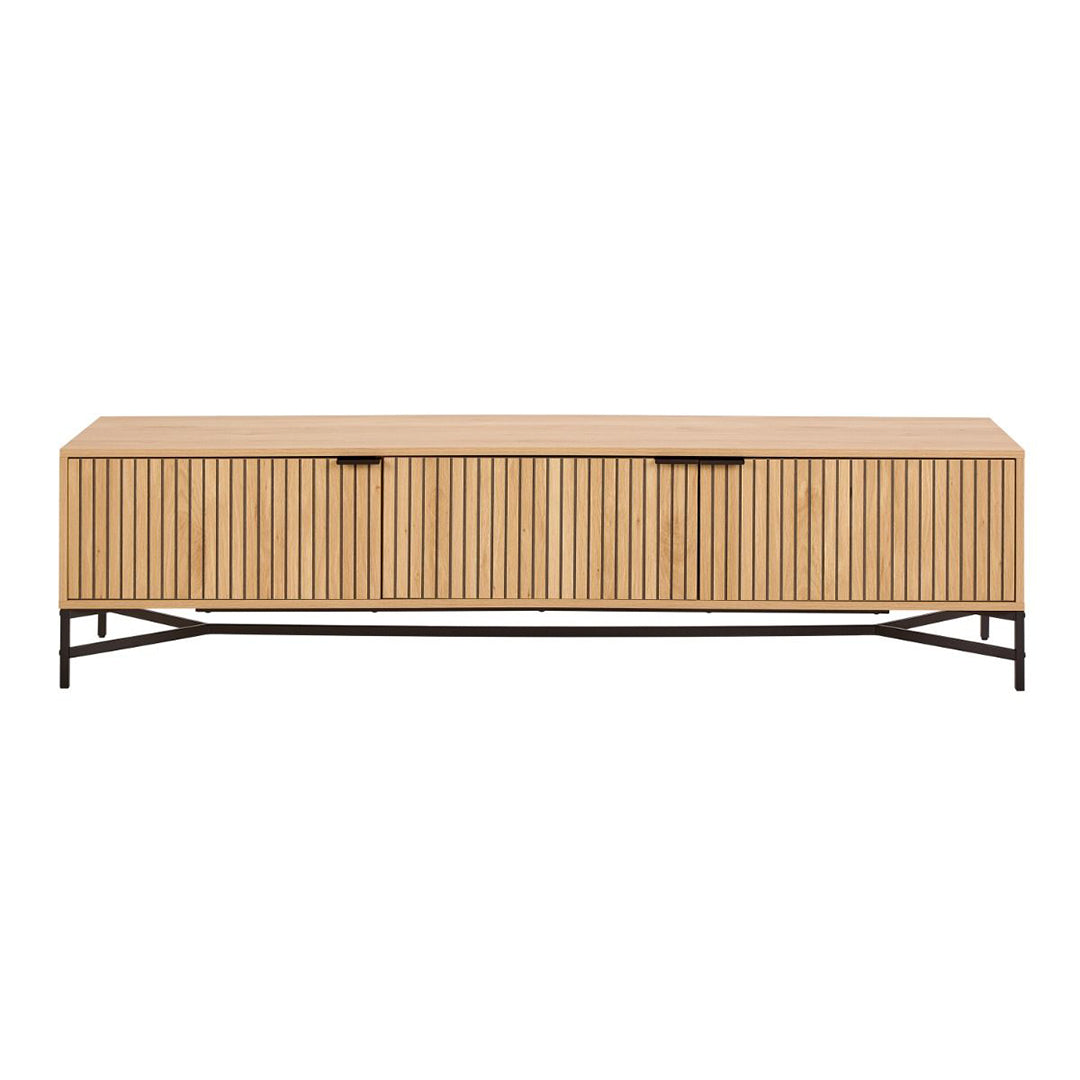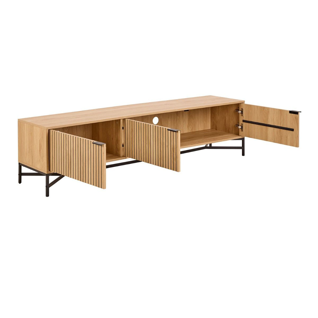 Transform your living - room with the Wooden TV Stand with 3 Doors - Jaipur, available at CozyFurnitureDirect. Designed with a blend of Scandinavian-inspired elegance and modern practicality, this wide TV cabinet makes a striking focal point while offering all the storage space you need for everyday living. Finished in a light wild oak decor with slatted oak-effect fronts, the Jaipur TV unit pairs beautifully with its sleek black powder-coated steel legs for a contemporary yet timeless aesthetic. With three spacious doors and additional open shelving, it provides discreet storage for media essentials, consoles and accessories, ensuring your space stays clutter - free. At 176.4 cm wide, this TV stand is ideal for medium to large spaces and is compatible with TVs of up to 75 inches. Practical, stylish and crafted with durability in mind, this piece is a standout addition to any modern UK home.