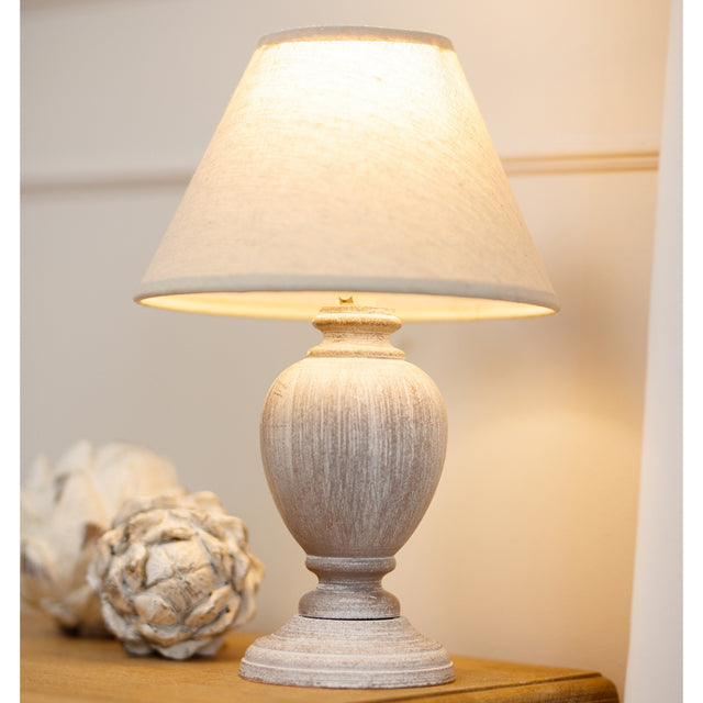 Enhance your interiors with the Beige Linen Shade Table Lamp with Pewter Wooden Base - Otem, available at CozyFurnitureDirect. Featuring a beautifully distressed pewter-toned urn-shaped base, this lamp combines timeless charm with an artisanal touch. The neutral linen shade complements the textured base perfectly, diffusing a warm and welcoming glow that transforms any space. Whether styled as a focal point or paired with other neutral tones for a coordinated look, the Otem lamp brings sophistication and versatility to both rustic farmhouse and modern minimalist UK homes.