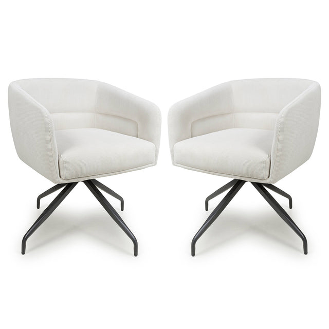 The Artemis Set of 2 Corduroy Fabric Swivel Dining Chairs, available at CozyFurnitureDirect, combines sleek modern design with ultimate dining comfort. Upholstered in a beautiful white fine ribbed corduroy fabric, these chairs offer a tactile, inviting finish that adds warmth and elegance to any dining space. Their bucket-shaped seats with gently tapered high armrests provide ergonomic support, while the sturdy four-pronged black metal base ensures durability and stability. With a smooth 360° swivel, the Artemis chairs are as practical as they are stylish, making them a perfect choice for modern UK homes.
