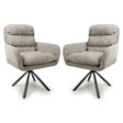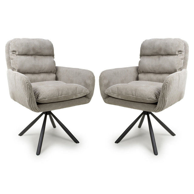 Add comfort and contemporary design to your dining space with the Cassidy Corduroy Fabric Swivel Dining Chairs from CozyFurnitureDirect. Sold in a set of two, these deluxe cushioned chairs are upholstered in luxuriously soft ribbed mink corduroy fabric, bringing both style and texture to modern dining rooms. Designed with a large sloping bucket seat and high armrests, they provide exceptional comfort for family meals or entertaining. The contoured and pleated cushions are removable for easy cleaning, while the sturdy black metal tripod base offers 180-degree swivel with self-return. Adjustable feet ensure stability on any surface, making the Cassidy chairs both practical and stylish for UK homes.