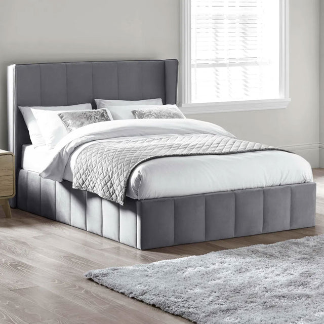 Experience the perfect mix of luxury and practicality with the Katie Fabric King Size Ottoman Storage Bed, available exclusively at CozyFurnitureDirect. Upholstered in soft grey velvet, this elegant winged bed combines timeless design with functional storage. The tall, winged headboard adds sophistication and provides a comfortable backrest for evening reading or relaxation. Built with an easy-lift ottoman mechanism, the frame reveals generous under bed storage - ideal for bedding, clothing, or other household essentials. Thoughtfully crafted using sustainable materials, the Katie bed offers a mindful approach to modern living, blending comfort, beauty, and practicality effortlessly for UK bedrooms.