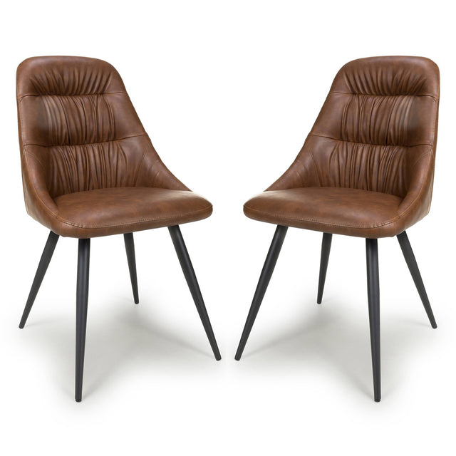 The Corinth Set of 2 Faux Leather Dining Chairs, available at CozyFurnitureDirect, is a sleek modernist seating option designed to bring style and comfort to your dining space. Upholstered in an eye-catching tan leather effect, the chairs feature a segmented backrest with two horizontal stitching bands that create attractive vertical pleating for added texture and elegance. The low side arms flow seamlessly into a padded seat for ergonomic comfort, while the angled black metal legs provide stability and a contemporary edge. Sold in pairs, the Corinth chairs are perfect for UK homes seeking bold design with everyday practicality.