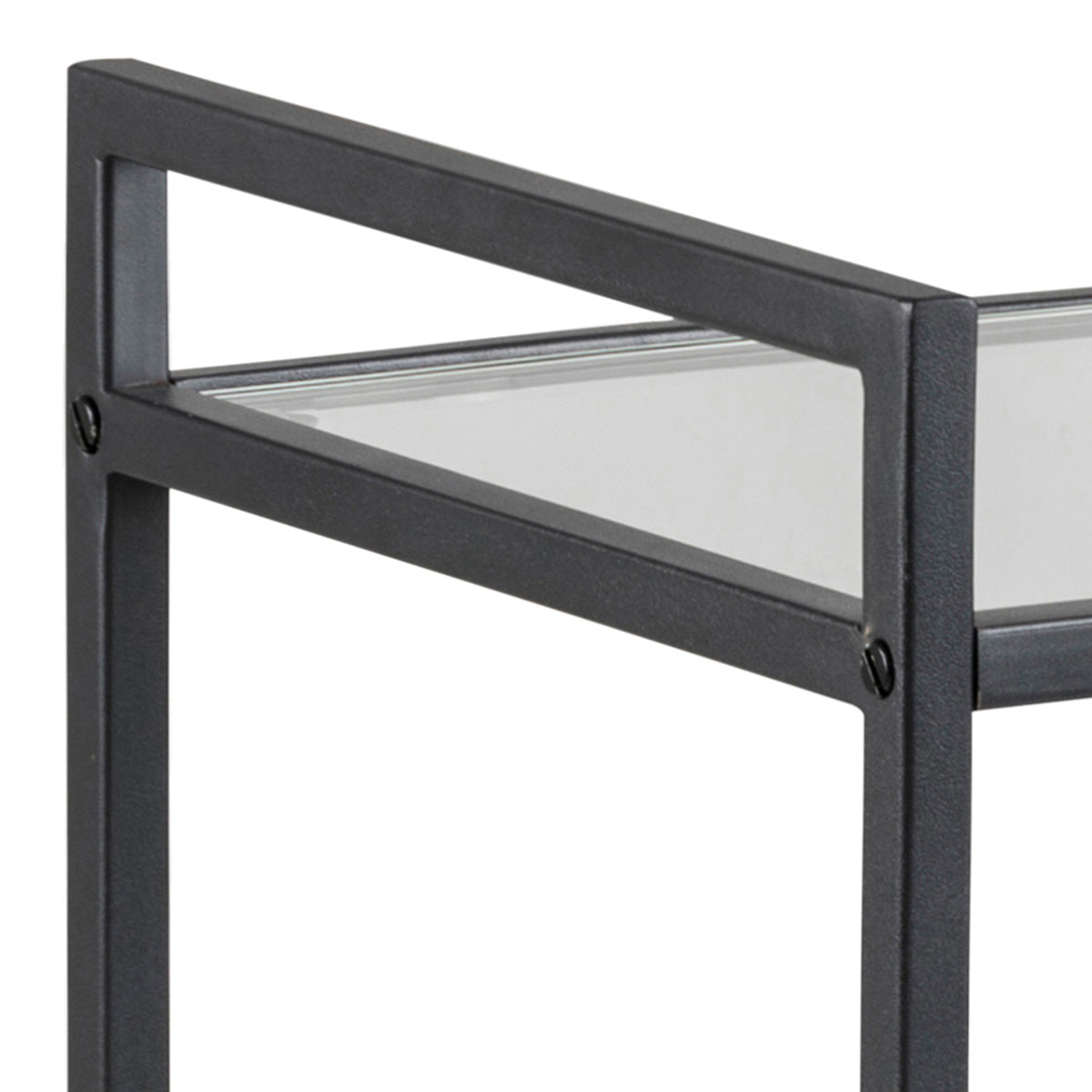 Impress your guests with the stylish Seaford Metal Drinks Serving Trolley with Glass Top, available at CozyFurnitureDirect. Designed with a sleek matte black steel frame, a clear tempered glass top, and a frosted black glass shelf, this trolley exudes modern sophistication with an industrial edge. Whether used as a chic drinks station, a mobile serving cart, or a versatile display piece, it adds both elegance and practicality to your entertaining space. Lightweight yet durable, it's the perfect choice for hosting social gatherings or upgrading your home bar setup.
