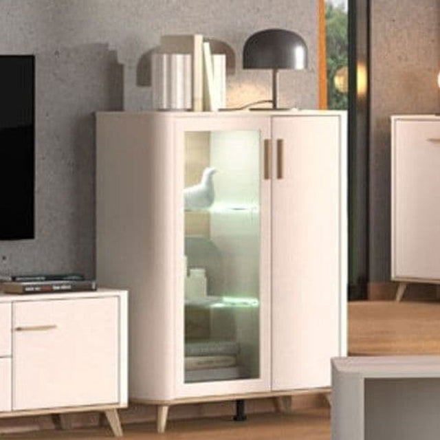 Combine elegance and practicality with the Wooden Display Cabinet Wide With 2 Doors - Dearborn, available at CozyFurnitureDirect. The Dearborn cabinet showcases a sophisticated cashmere and oak effect finish, featuring one glass display door and one closed door, each with practical interior shelving to organise and showcase your favourite items. Its low, compact design makes it perfect for living - rooms, accent walls, or placement under windows. Soft curved edges and elevated legs enhance its contemporary, airy aesthetic. Measuring 116.5cm high, 90cm wide, and 40cm deep, this flat-packed unit is an ideal stylish storage solution for modern British homes.