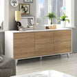 Enhance your home organisation with the Wooden Storage Cabinet With 3 Doors - Troika, available at CozyFurnitureDirect. The Troika sideboard features a stylish combination of sleek white finish and warm oak effect fronts, blending modern design with timeless charm. With three spacious doors, it provides ample storage to neatly organise dishes, linens, or other household essentials. Measuring 75cm high, 154cm wide, and 41cm deep, this flat-packed cabinet is a versatile and elegant addition to dining rooms, living areas, or hallways in British homes.