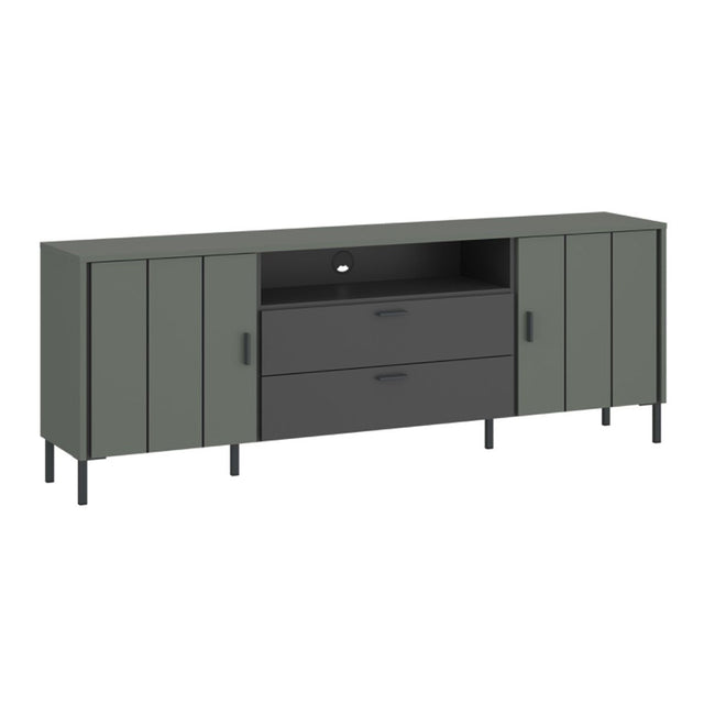 Elevate your living - room with the Arundel Wooden TV Stand 173cm Wide With 2 Doors and 2 Drawers, available at CozyFurnitureDirect. Featuring an elegant finish with subtle anthracite accents, this stylish cabinet perfectly blends modern design with timeless sophistication, making it an excellent choice for a variety of UK home interiors - from contemporary and vintage to eclectic and loft styles. Crafted from durable laminated chipboard and supported by high metal legs, it offers stability and a light, airy presence. The TV stand includes spacious shelves behind soft-closing doors and two generous full-extension drawers with smooth ball bearing runners, providing ample and organised storage for all your multimedia devices, accessories, and essentials. Manufactured in Poland with meticulous craftsmanship, the Arundel TV stand brings both practical functionality and refined elegance to your living space, exclusively at CozyFurnitureDirect.